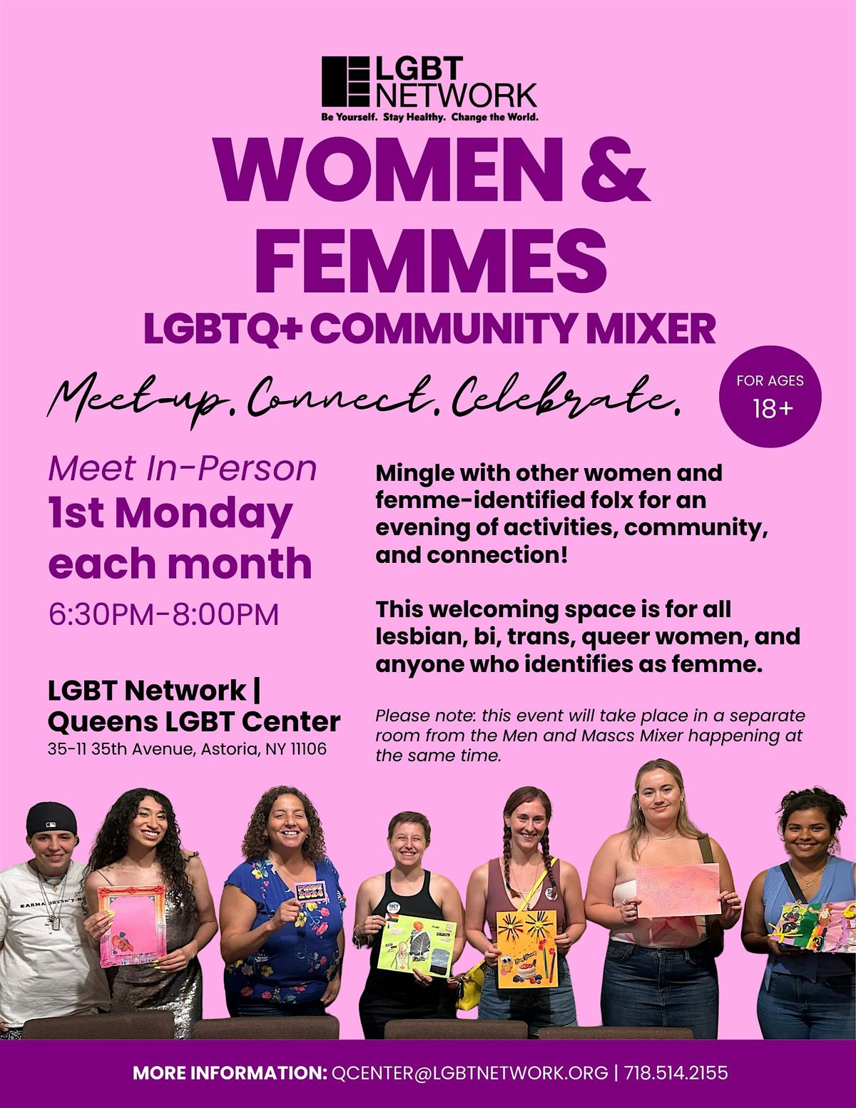 Meet-up with other women and femme-identified folks at our Women and Femmes Mixer! This is a space for women, femme-identified people, or those who feel comfortable and seen in women’s spaces to come together for games and activities, sparking new connections, and strengthening community bonds. Please note that this event coincides with our Women and Femmes Mixer, taking place in a separate room at our Queens LGBT Center.