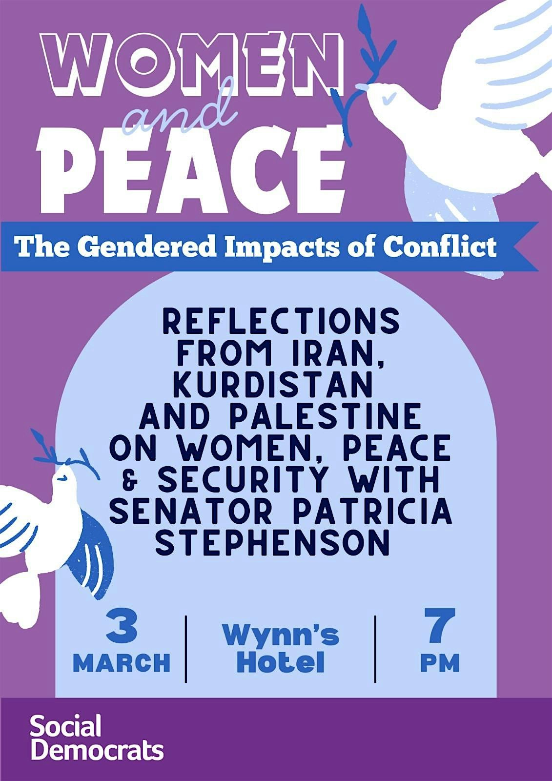 Senator Patricia Stephenson and the Social Democrats invite you to a panel event exploring the gendered impacts of conflict and the vital importance of the Women, Peace & Security agenda, including UN Resolution 1325.