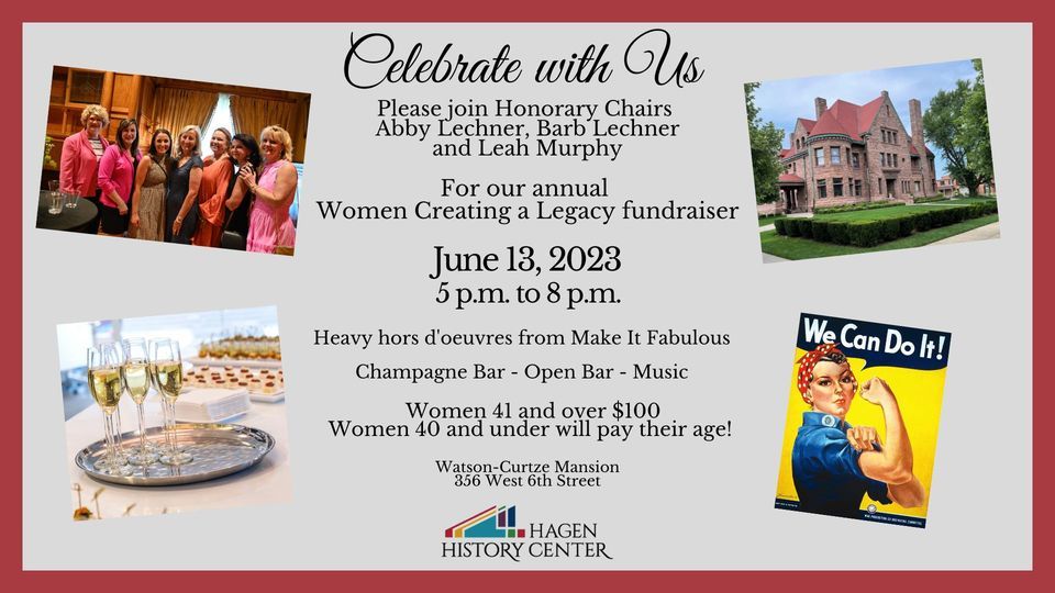 Hagen History Center, and honorary chairpersons Barb Lechner, Abby Lechner, and Leah Murphy, invite you to make history with us by supporting the sixth annual Women Creating a Legacy event.This event is a cocktail party fundraiser for women only. Enjoy hors d’oeuvres and drinks while touring Erie’s newest museum.