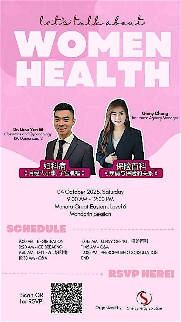 Join us for an informative and empowering Women Health Talk at Menara Great Eastern. This event is designed to educate and inspire women to take charge of their health and wellness. Our expert speakers will cover a range of topics including menstru pain, treatments for fibroids and critical illness insurance coverage. Don't miss this opportunity to learn, ask questions, and connect with other like-minded individuals. Come join us for a fun and enlightening event!