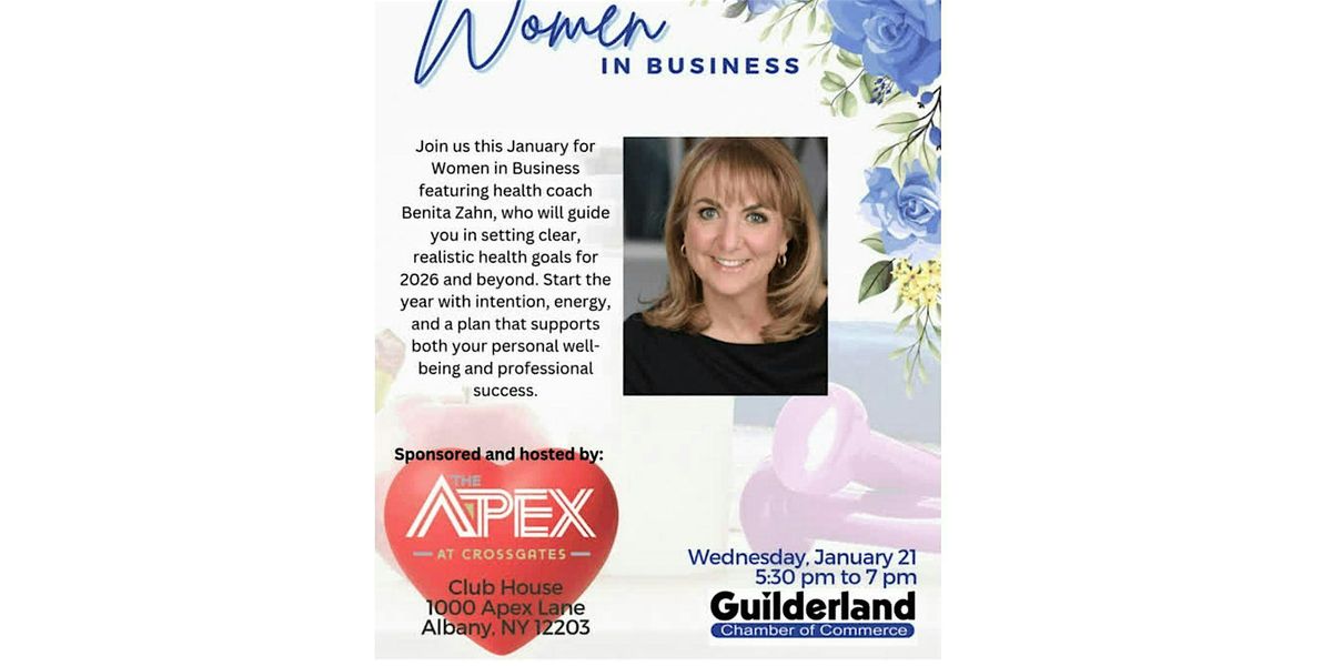 Join us this January for Women In Business featuring health coach Benita Zahn, who will guide you in setting clear, realistic heath goals for 2026 and beyond. Start the year with intention, energy, and a plan that supports both your personal and professional success. Sponsored and hosted by The Apex at Crossgates Apartments.