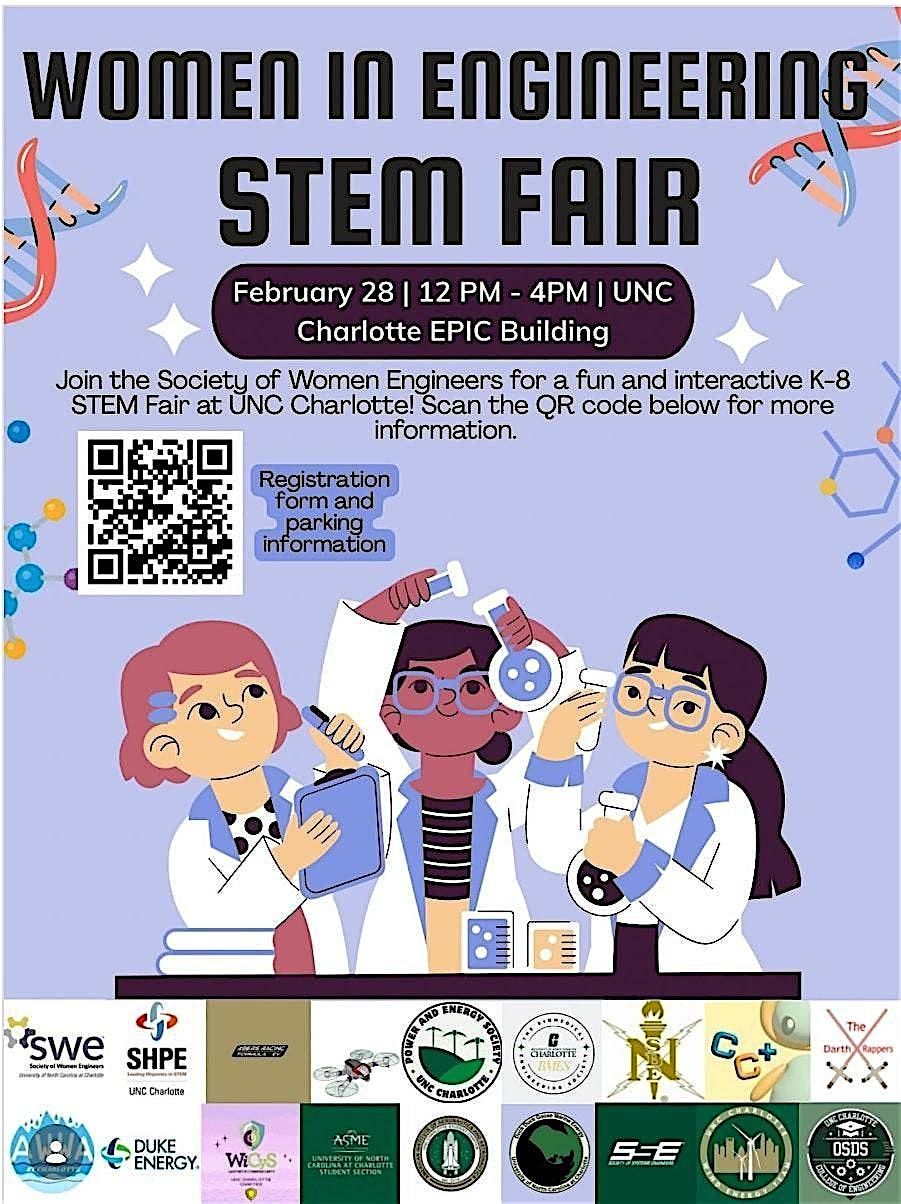 Join the Society of Women Engineers for the K–8 WIE STEM Fair at UNC Charlotte! This interactive STEM fair will feature hands-on activities for both K–5 and 6–8 students, allowing participants to explore engineering concepts in a fun, engaging environment. Attendees will have the opportunity to experience a wide variety of activities, including FIRST LEGO League robot demonstrations, a Formula EV car, drones, a robotic dog, and many more exciting exhibits led by engineering students and organizations.