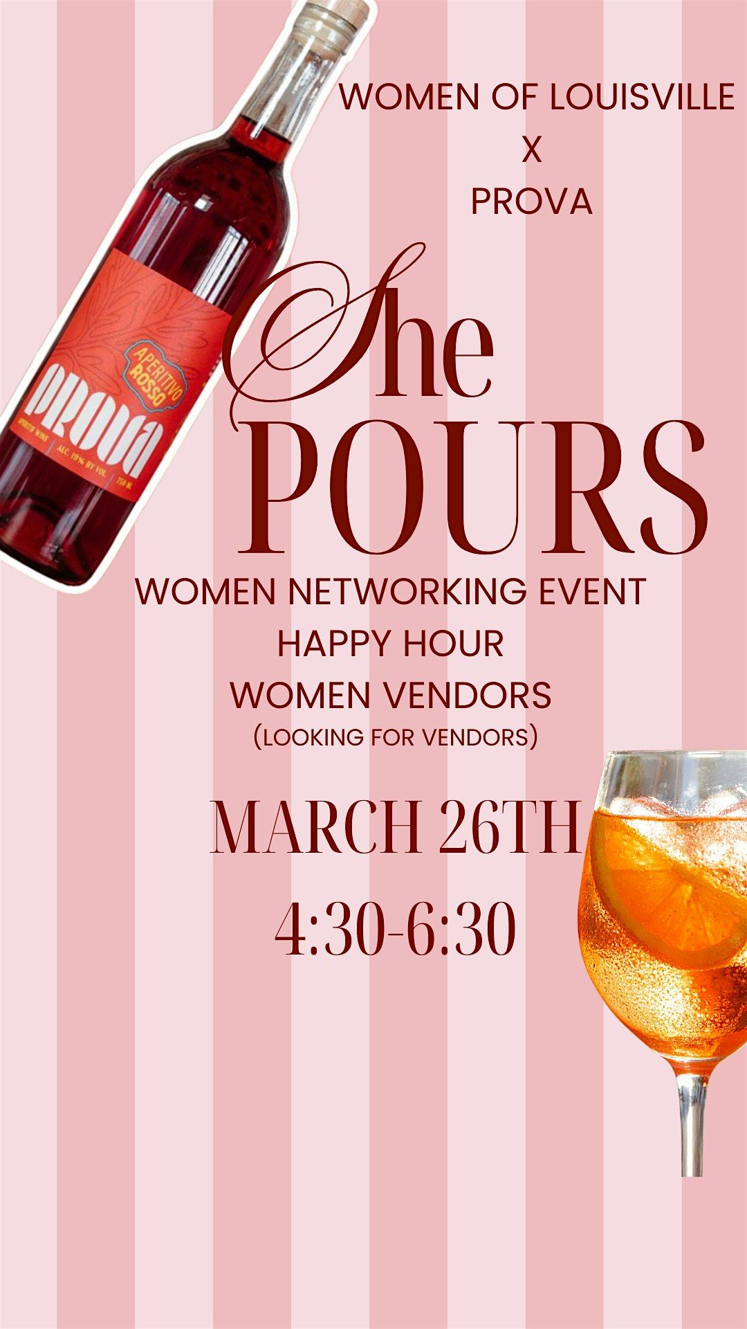 Join us for She Pours, a Women of Louisville networking happy hour in collaboration with Prova — bringing together women entrepreneurs, creatives, and business owners for an evening of connection, conversation, and community.