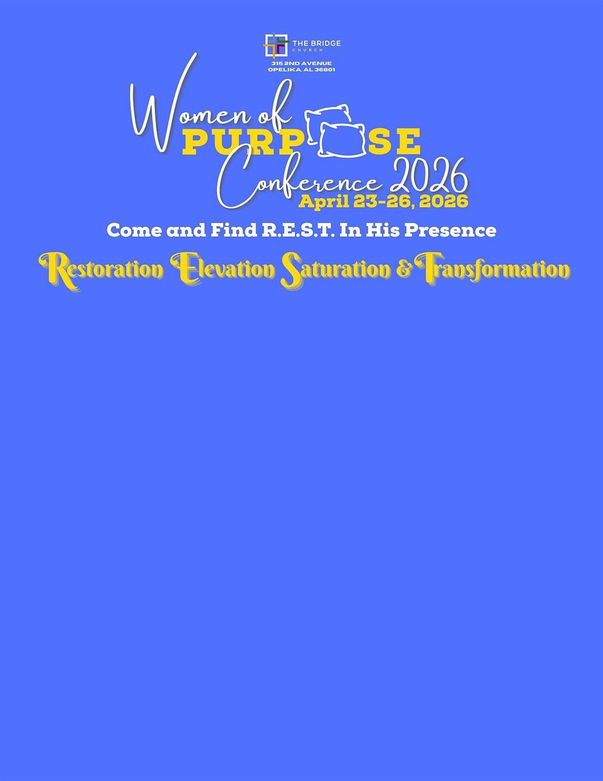 Please join The Bridge Church of Alabama for its 5th Annual Women of PURPOSE Conference, "Come and Find REST in His Presence: Restoration, Elevation, Saturation, and Transformation.