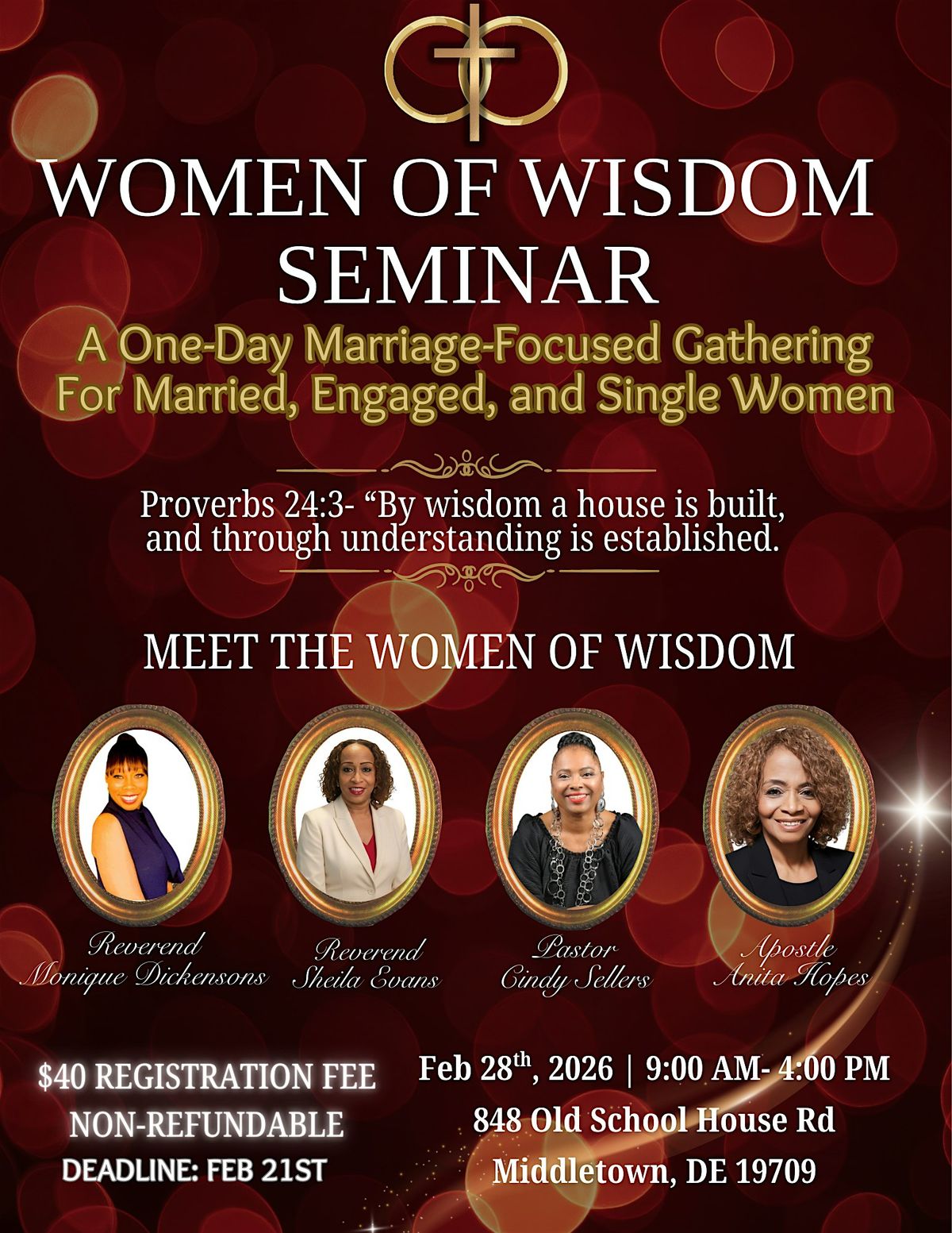 Join God in Action Ministries and Daughter’s of Zion for Women of Wisdom One-Day Seminar. This event is designed for those Married, Engaged and Single. It will be held on February 28, 2026, from 9:00 AM to 4:00 PM at 848 Old School House Rd. Middletown, DE 19709