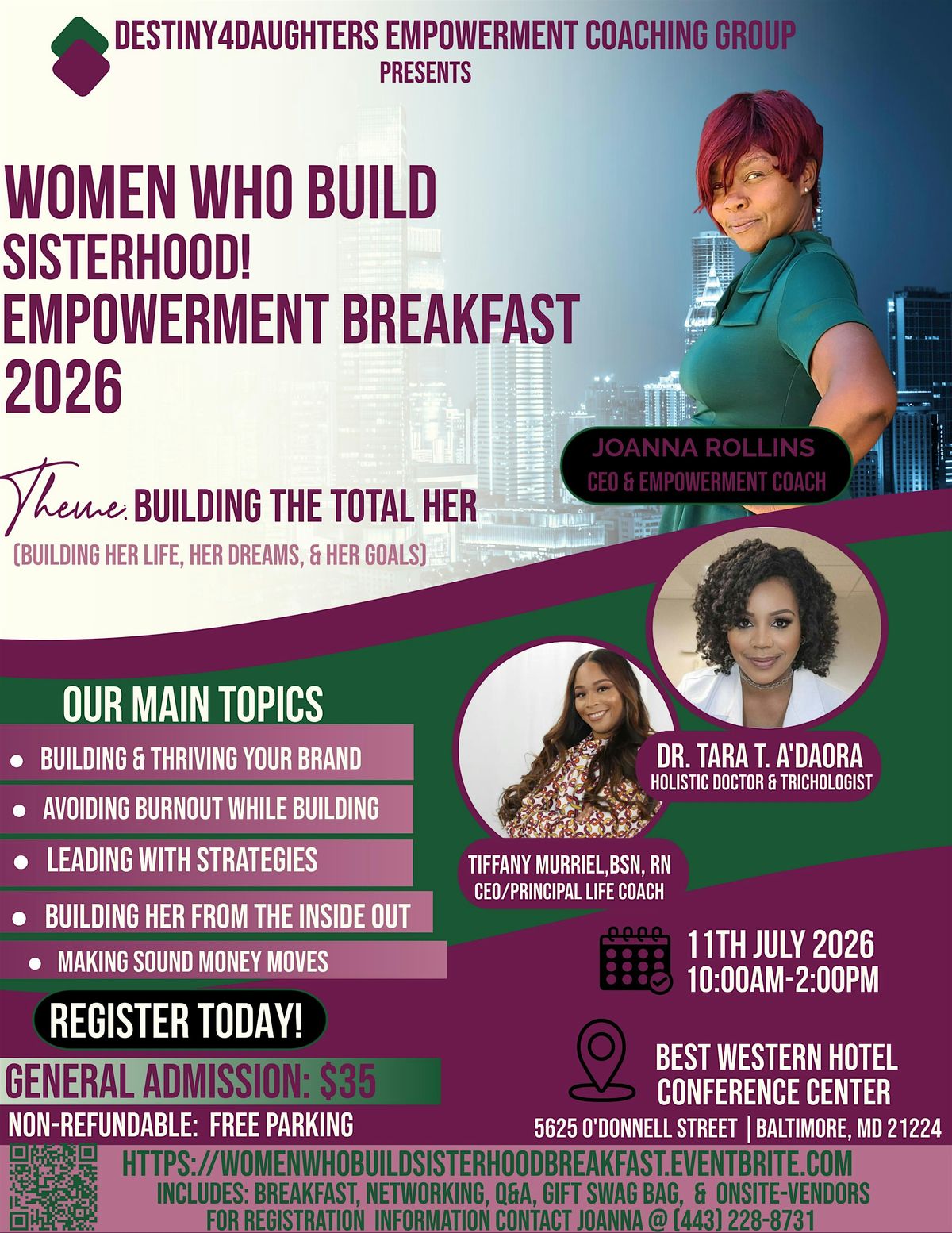 Join us for the Women Who Build Sisterhood! Building the Total HeR Empowerment Breakfast at the Best Western Plus Hotel & Conference Center on July 11, 2026 at 10:00 AM (Eastern Time). This is your chance to connect, empower, and celebrate with amazing women building a strong sisterhood. Come hungry for inspiration, great food, and meaningful conversations. Don’t miss out on this uplifting morning designed just for you!
