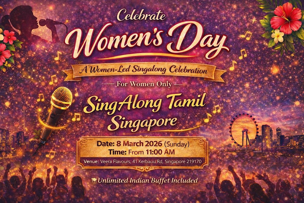 Come join us in person for a fun-filled Women's Day SingAlong in Tamil! It's the perfect chance to celebrate women and enjoy singing your favorite Tamil songs together. Whether you're a solo singer or love group vibes, this event is all about good music, great company, and amazing vibes. Don’t miss out on this lively gathering in Singapore, bring your friends and let’s make some joyful noise!
