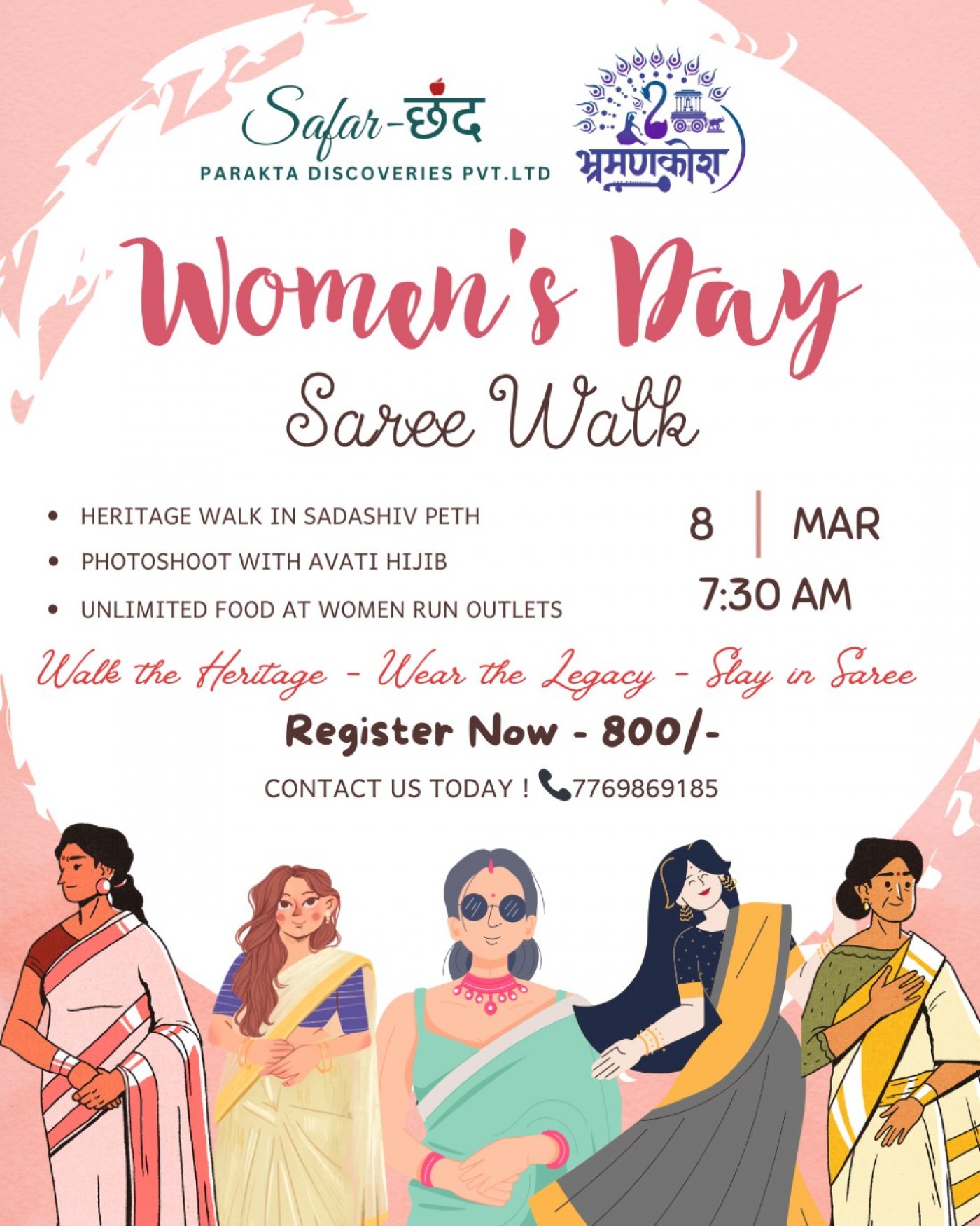 Celebrate Women's Day in a unique and empowering way with Safar Chhand's "Women's Day Special - Saree Walk" event! Immerse yourself in a day dedicated to honoring women through heritage exploration, glamorous photoshoots, and a gastronomic adventure at women-run outlets.