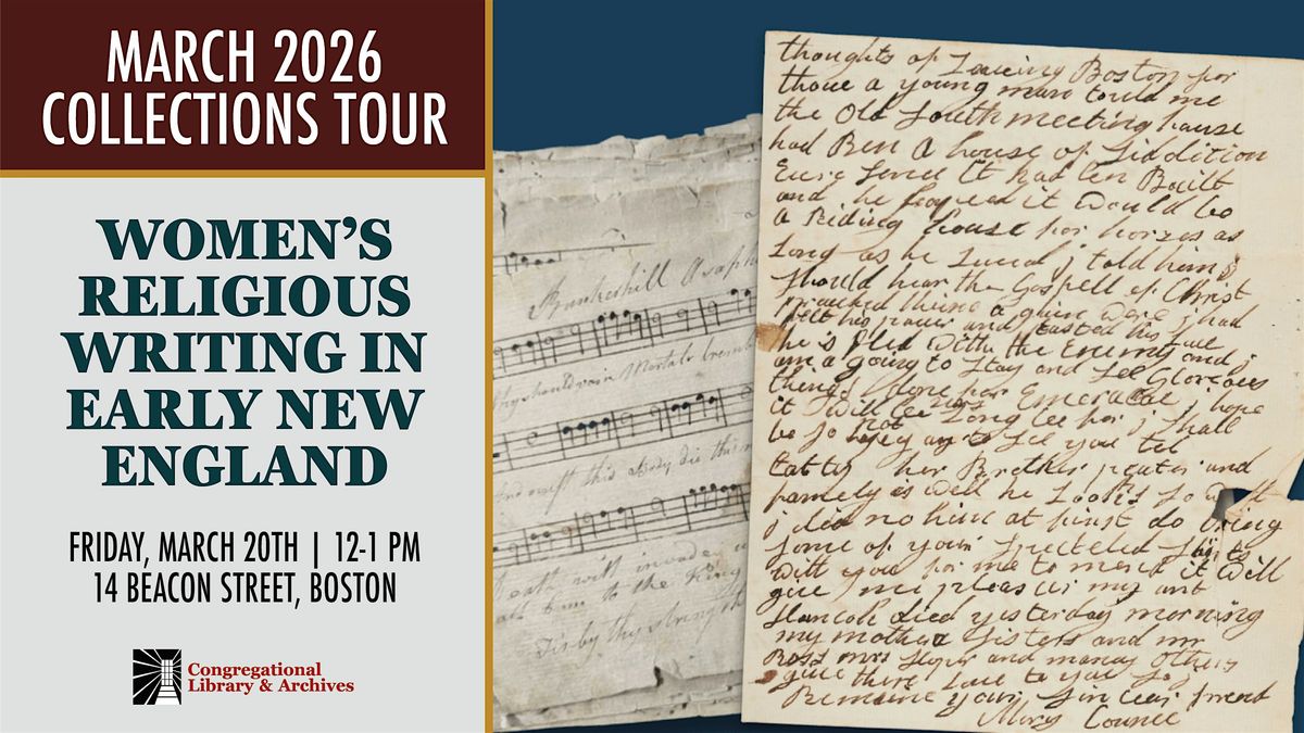 The Congregational Library & Archives holds important collections of women’s religious writings such as diaries, letters, books, and church records from Massachusetts in the seventeenth and eighteenth centuries. This tour will explore some highlights from these collections, including letters written by a woman during the 1775 siege of Boston, a 250-year-old manuscript music book, religious testimony from an enslaved woman, and a diary from the 1740s.