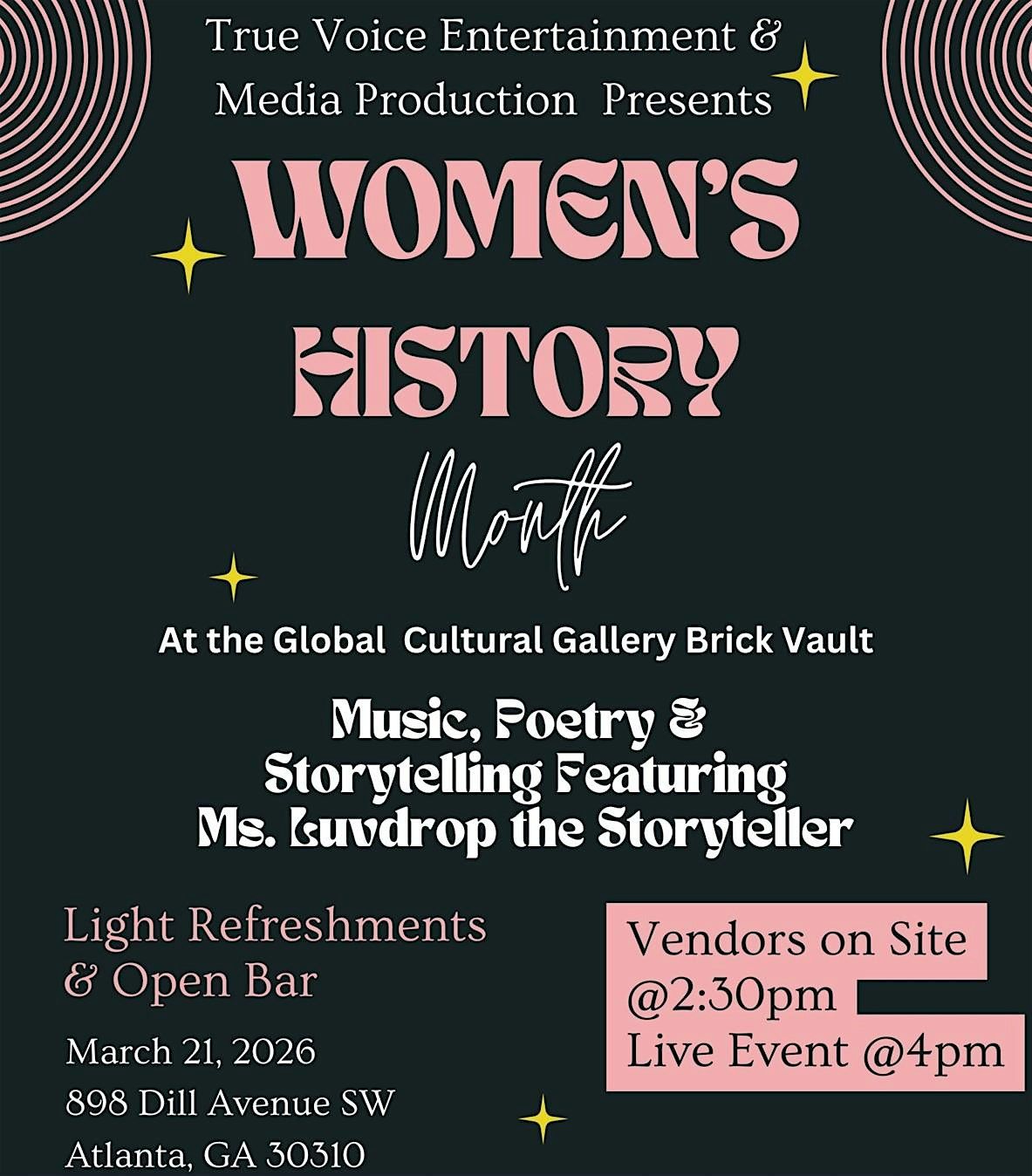 An evening to shop, socialize and celebrate Women's History Month with us. Live music selection, Poetry and Ms. Luvdrop the storyteller.About this Event