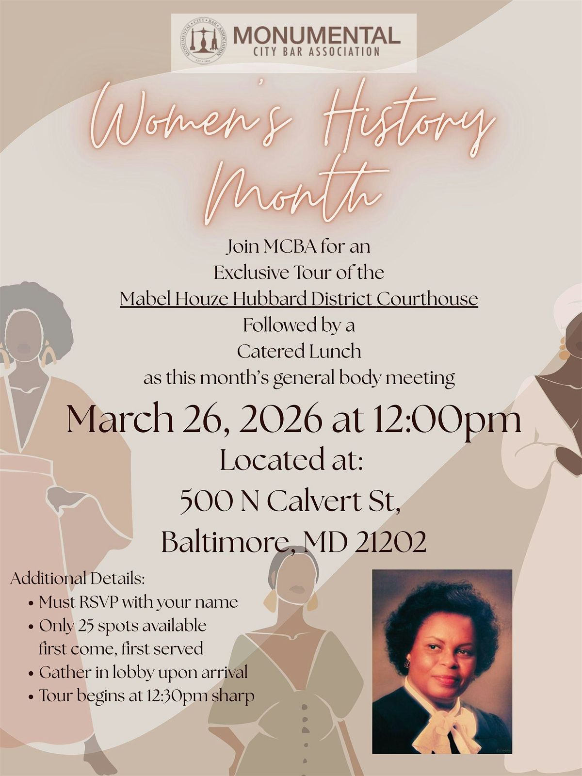 Join MCBA for an exclusive tour of the Mabel Houze Hubbard District Courthouse, followed by acatered Lunch as March’s general body meeting.