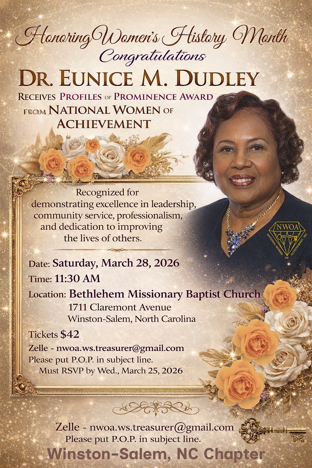 Join us for a powerful and inspiring luncheon in honor of 2026 International Women’s History Month, as we celebrate the extraordinary achievements of Dr. Eunice M. Dudley and fellow distinguished honorees - recipients of the prestigious Profiles of Prominence Award, presented by the National Women of Achievement – Winston-Salem, NC Chapter during the Southeast Region celebration.