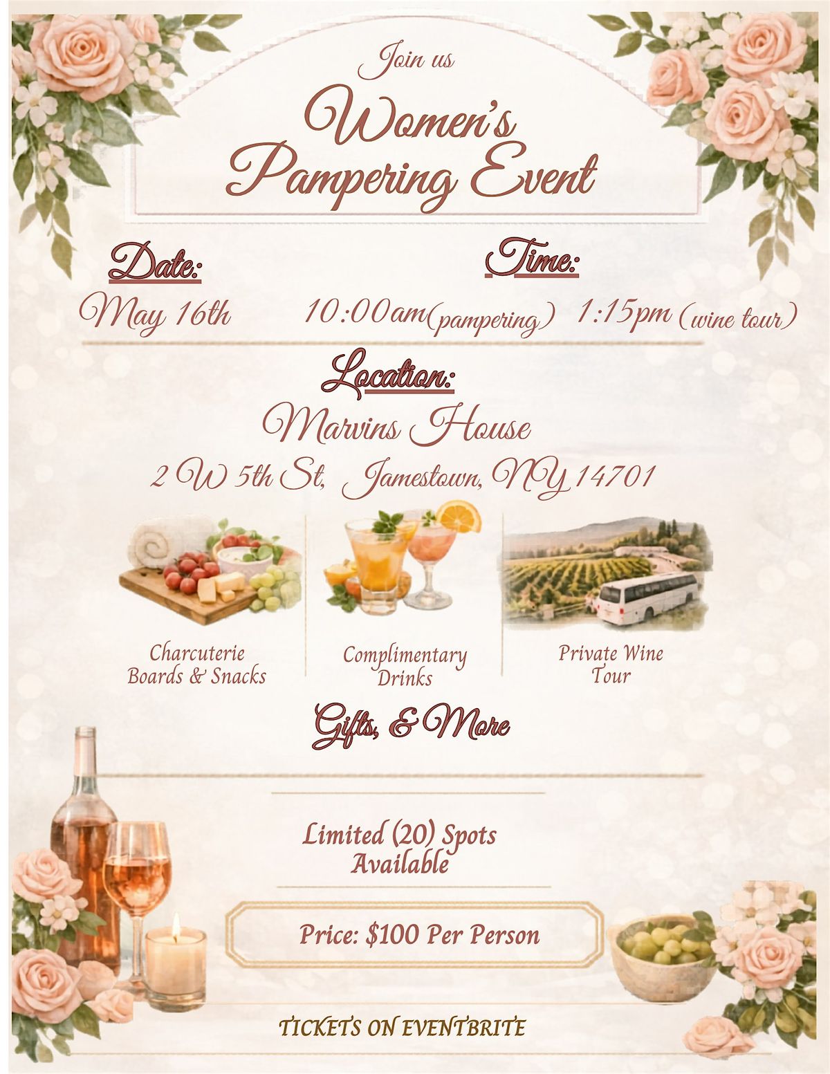 This event is intentionally intimate, with limited spots to keep the atmosphere warm, relaxed, and personal.(20 people for pampering + wine tour) (10 people for only pampering)