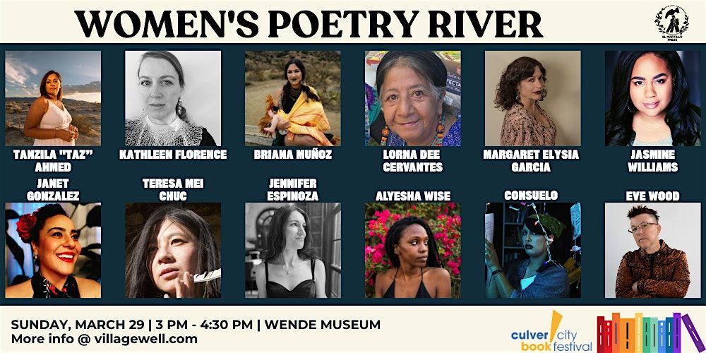 Celebrating Women's History Month, twelve incredible women writers from Los Angeles and beyond come together for a poetry river in the courtyard of the Wende Museum for the Culver City Book Festival! What is a poetry river? It's a reading where each poet reads one piece at a time and where each poet's reading flows into the other. Come hear as this diverse lineup shares their perspectives on womanhood, women's rights, femininity and the divine feminine, history and culture, contemporary politics, and more!