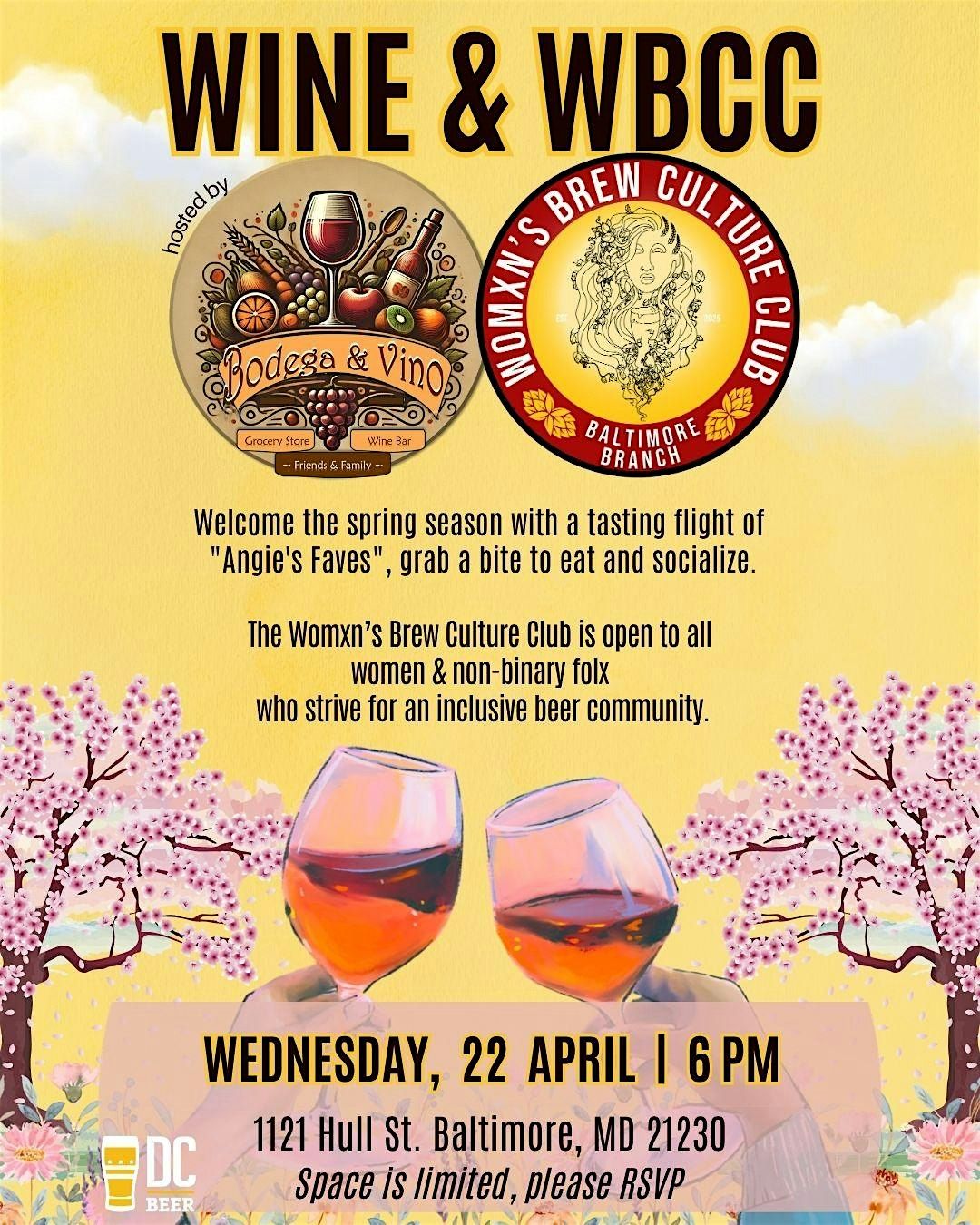 The Womxn's Brew Culture Club Baltimore is excited to invite you to a mid-week happy hour at Bodega and Vino. This Puerto Rican-owned spot is more than just a wine bar and market; it is a welcoming "third space" designed for winding down at any time of day.As we welcome the spring season, please join us to enjoy a tasting flight of "Angie's Faves" and stick around to grab a bite to eat and socialize.Space for this event is limited, so please RSVP to secure your spot. Our WBCC Baltimore Branch lead, Amber, is looking forward to seeing new folks and hosting a fun, low key wine Wednesday gathering. See you there.