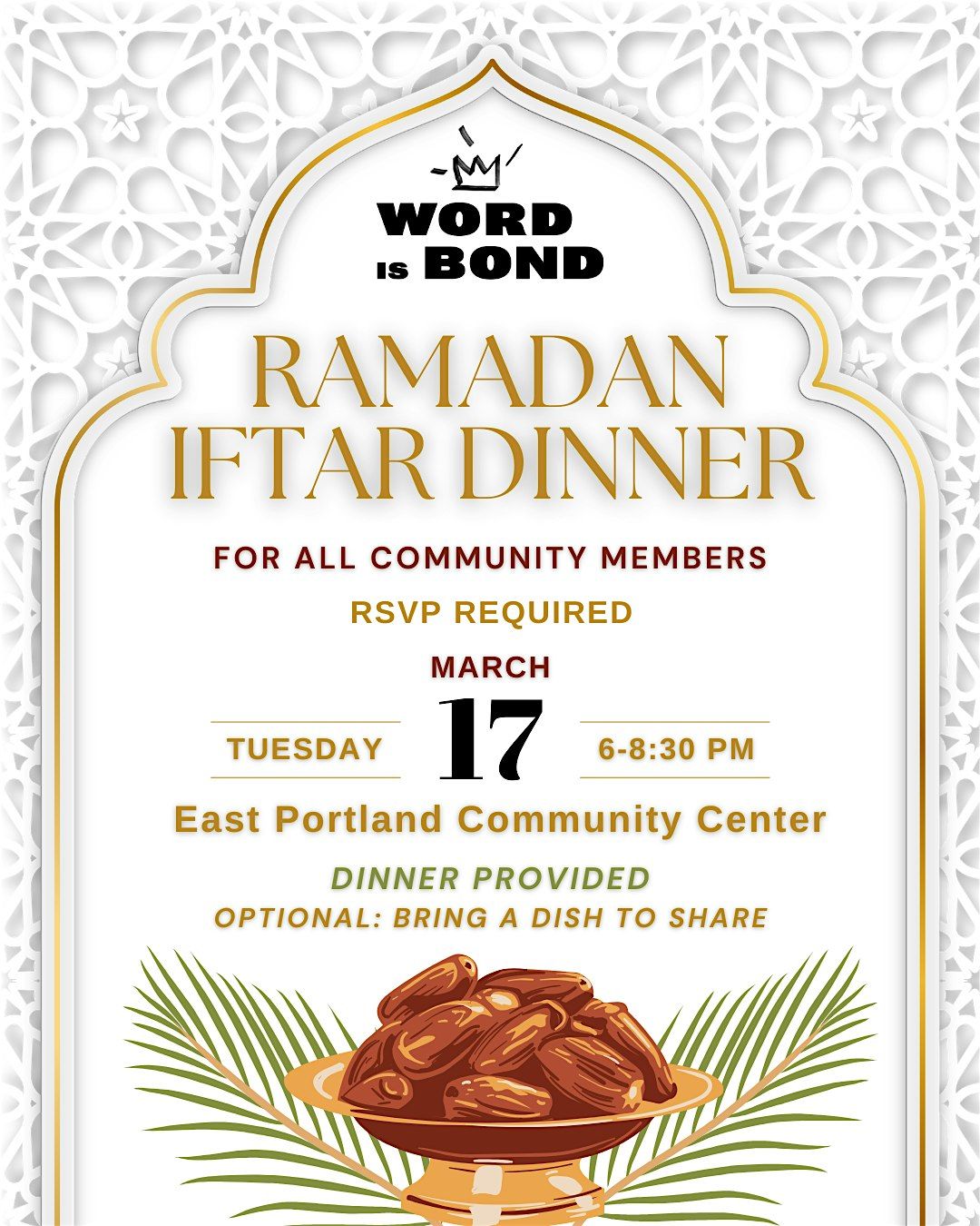 Join Word is Bond for a Ramadan Iftar Dinner, Tuesday March 17 2026 from 6 PM to 8:30 PM at the East Portland Community Center.