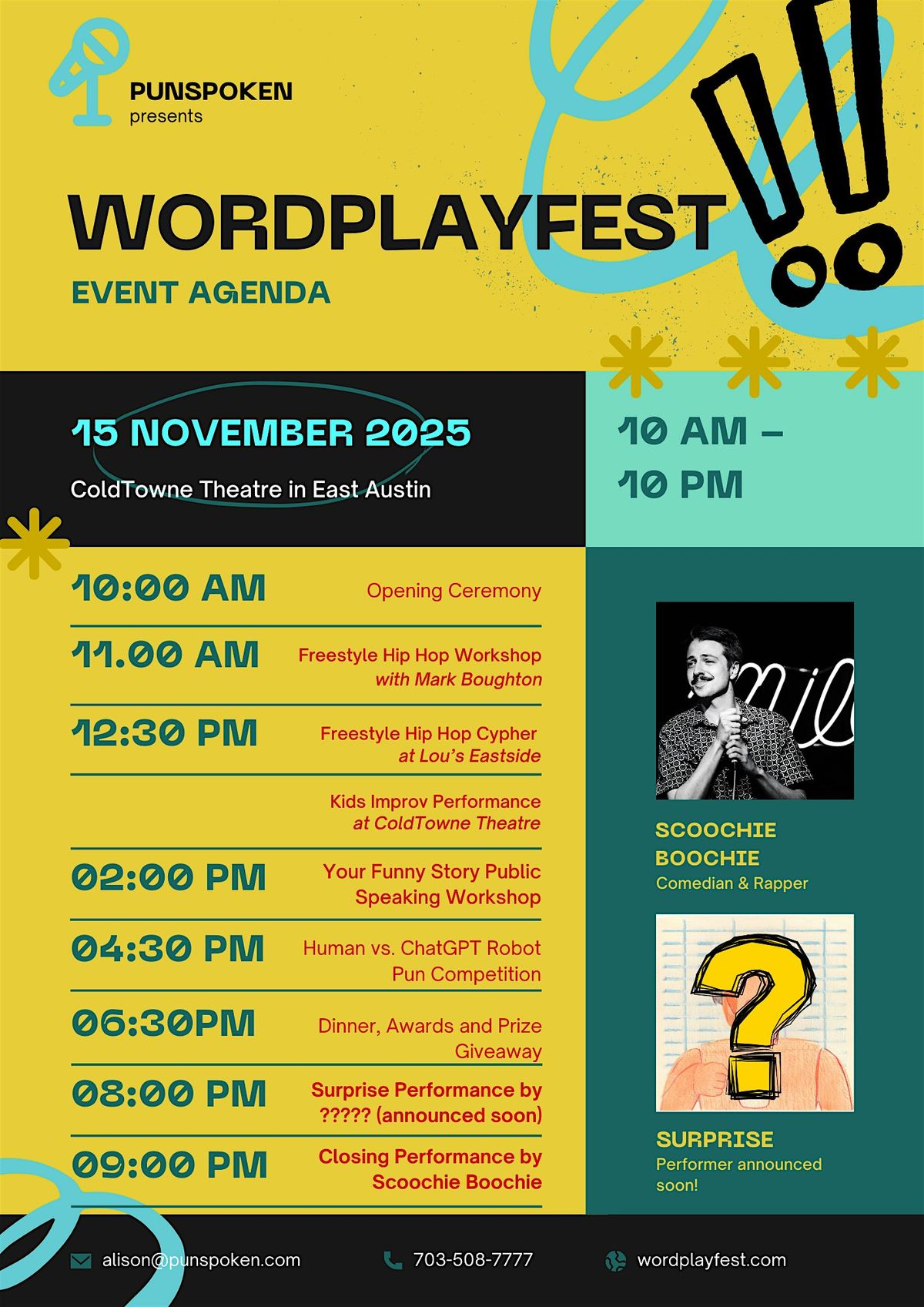 Wordplayfest s a one-day festival that empowers artists, performers, educators and leaders to expand their self-expression and create positive change in their communities through language arts–namely improv and standup comedy, music and storytelling.