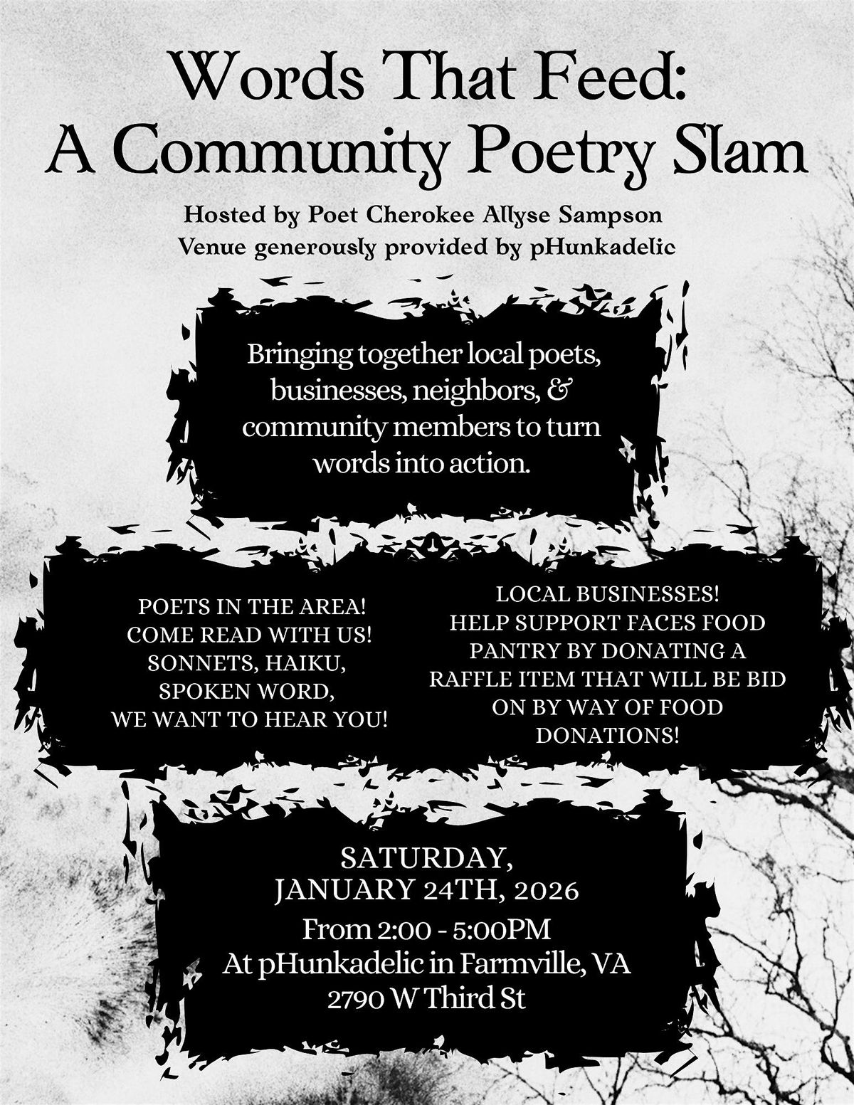 ‘Words That Feed’ is a community poetry slam hosted by poet Cherokee Allyse Sampson, bringing together local poets, neighbors, and community members to turn words into meaningful impact.