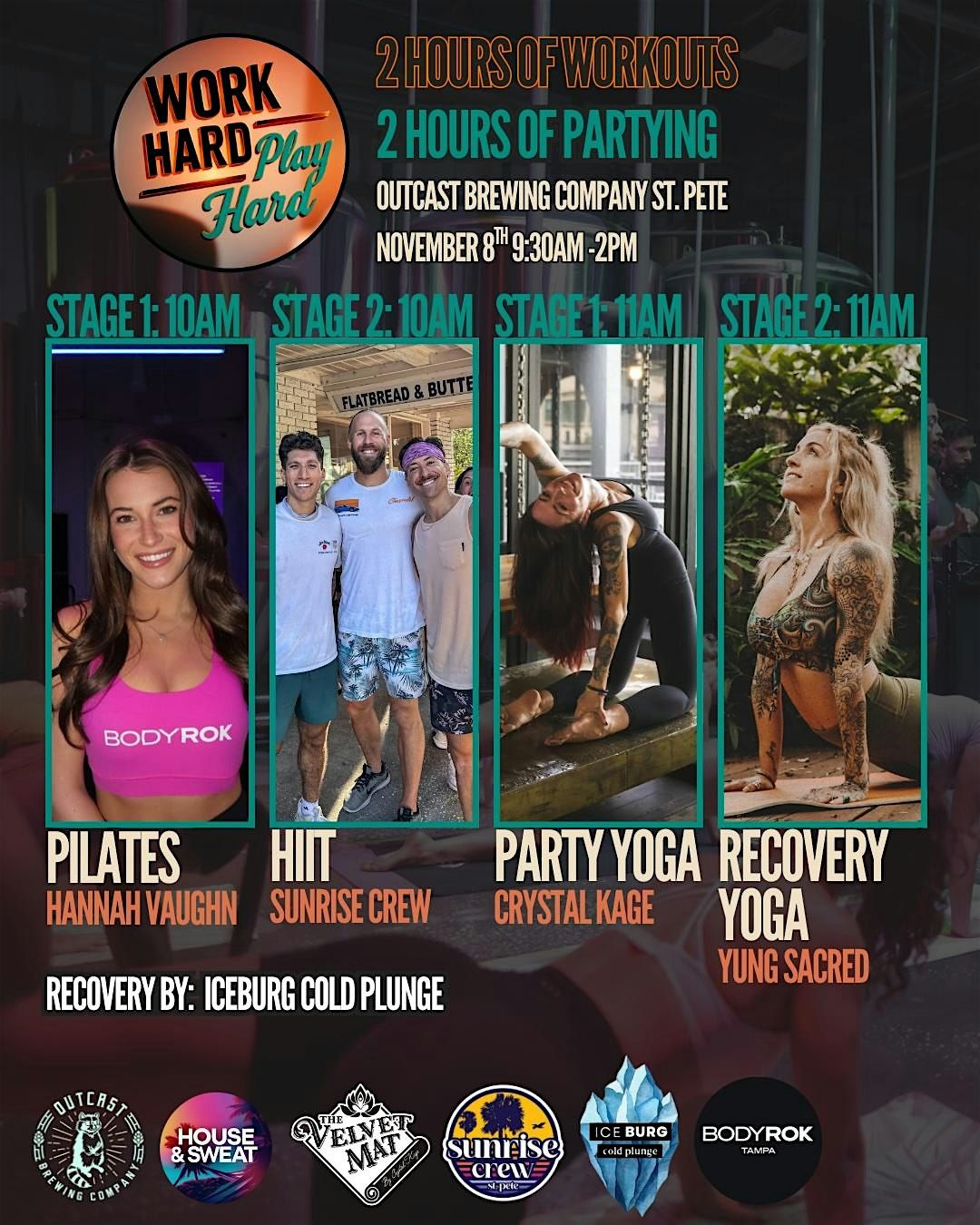 Workouts happen from 10am to Noon, then you are free to use the recovery station, grab some iced coffee, or head straight to the bar! Outcast Brewing Company has an awesome selection of drinks, including Kombucha on tap and THC beverages!