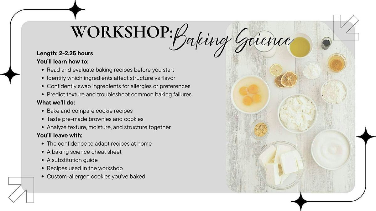 In this hands-on workshop, we’ll compare real cookie and brownie recipes, experiment with ingredient swaps like butter vs. vegan butter and egg vs. flax, and bake side-by-side variations to see how texture and flavor change. It’s part experiment, part tasting lab, and part guided kitchen session, designed to make baking feel approachable. You’ll taste, predict, and troubleshoot together, turning baking from guesswork into something that finally makes sense. Participants take home all of their individual baked goods.