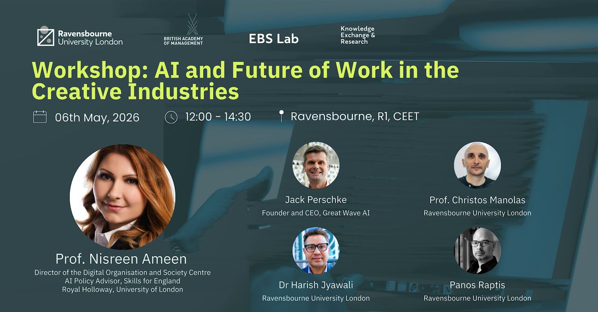 This workshop is organised by Ravensbourne University London, Emerging Technology, Business and Social Purposes (EBS Lab), in collaboration with the British Academy of Management (BAM) Human Resource Management SIG and the Cultural and Creative Industries SIG. The event will be held in person.