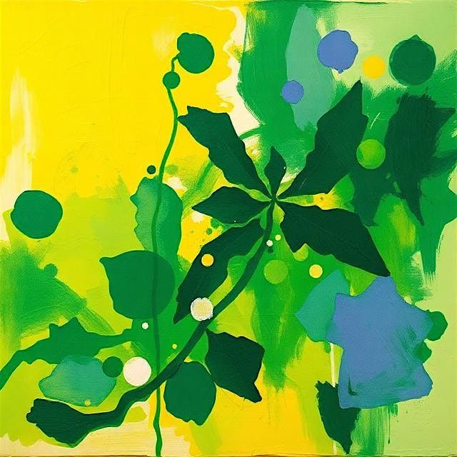 Let your marks grow wild. Inspired by the lush greens, sunlit yellows, and overlapping leaf shapes of a living canopy, this energizing acrylic class invites you to explore leaves through abstraction—focusing on color, rhythm, and movement rather than realism. Think silhouettes, shadows, and organic forms floating across fields of vibrant color.
