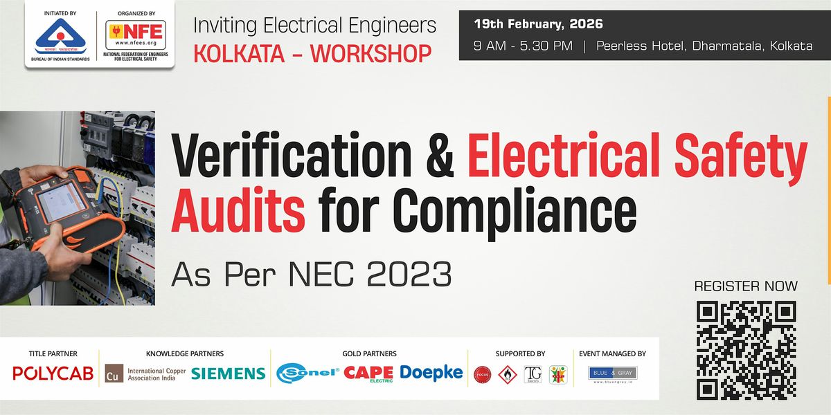Welcome to the Workshop in Kolkata on Verification & Electrical Safety Audits! Join us at Peerless Hotel Kolkata on February 19, 2026 at 9:30 AM (Asia/Kolkata). This workshop is perfect for anyone interested in learning more about verification processes and electrical safety audits. Come ready to engage with industry experts, ask questions, and expand your knowledge in a friendly and welcoming environment. Don't miss out on this opportunity to enhance your skills and network with like-minded individuals. We look forward to seeing you there!