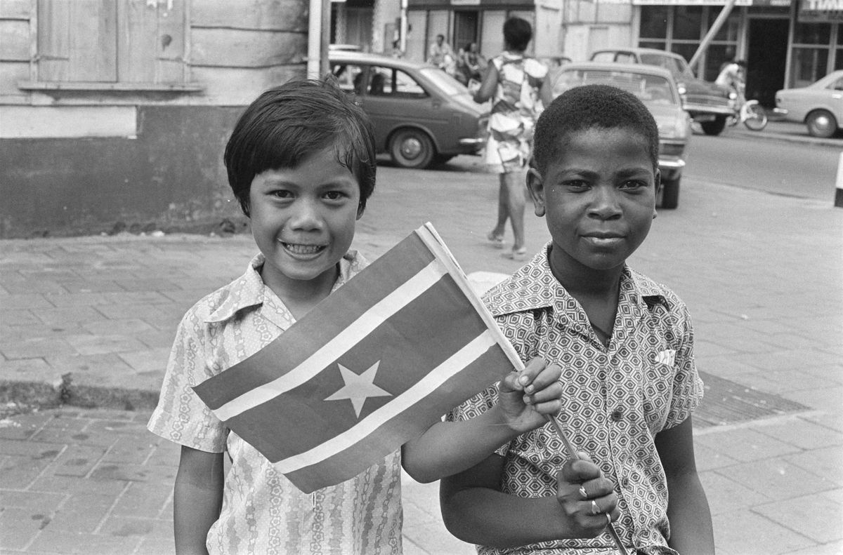 Afb. Surinaamse jongetjes met vlaggetjes van de Republiek, foto Bert Verhoeff, collectie Nationaal Archief