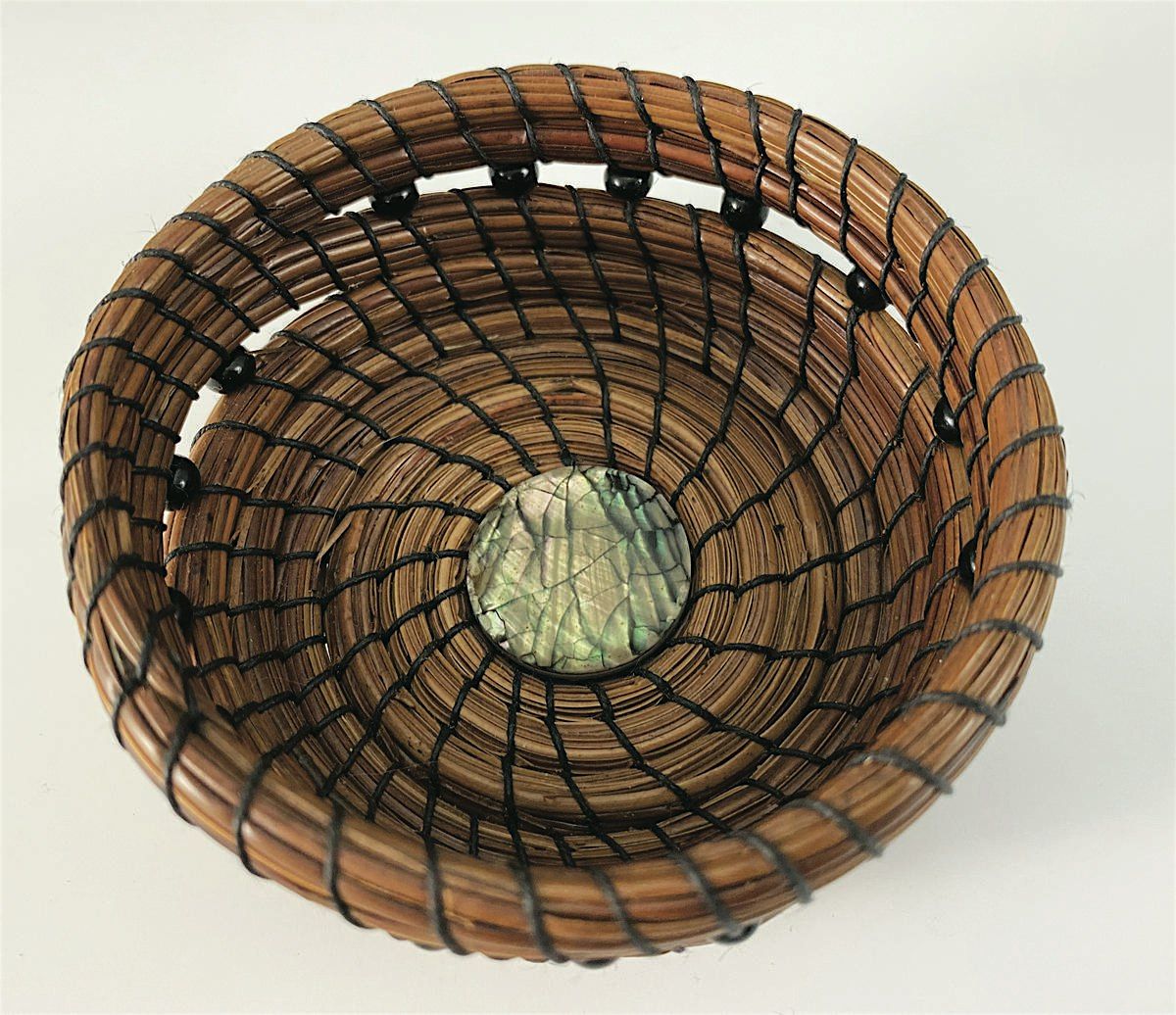 Learn to make a basket made from long leaf pine needles, using waxed Irish linen, an assortment of beads or other embellishments, starting with a stone center. Topics to be covered include the differences between pine needle types, preparing the needles, waxed Irish linen, basket centers, embellishing your basket, and how to start and how to finish your basket. Students have the option to weave a basket, a pendant, or an ornament. Basketweaving is a wonderful way to recycle from nature and is also a meditative activity.