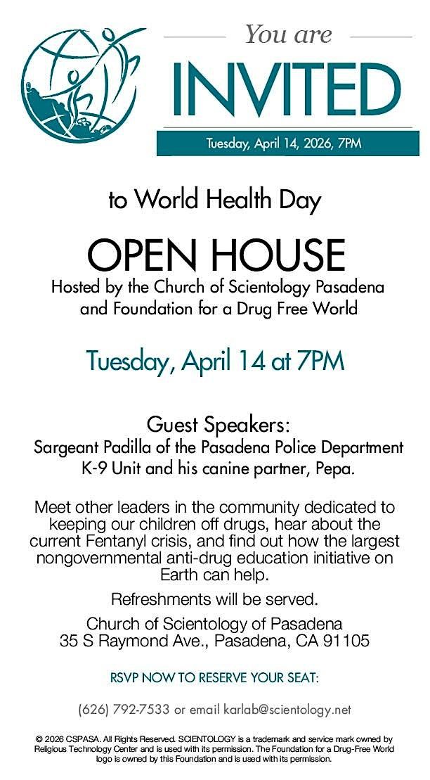 Join us on April 14, 2026 at 7:00 PM (Pacific Time) for a fun and casual evening at the Church of Scientology of Pasadena Auditorium. Meet the amazing K9 Department, learn about their work, and celebrate World Health Day with the community. Bring your friends and family for an up-close look at this incredible police dog Pepa and enjoy a relaxed, friendly atmosphere. Don’t miss out on this unique event!
