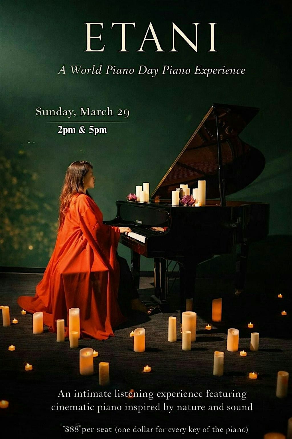 On the occasion of World Piano Day — Sunday, March 29 — Etani opens her music studio for an intimate 90-minute sound healing experience centered around Live Piano.