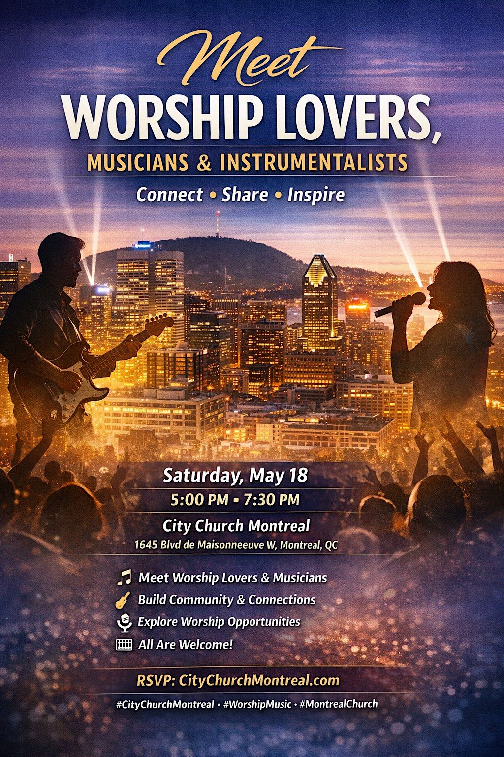 Meet Worship Lovers, Musicians & Instrumentalists is a special gathering in Montreal created to bring together people who share a passion for worship, music, and serving God through creativity.
