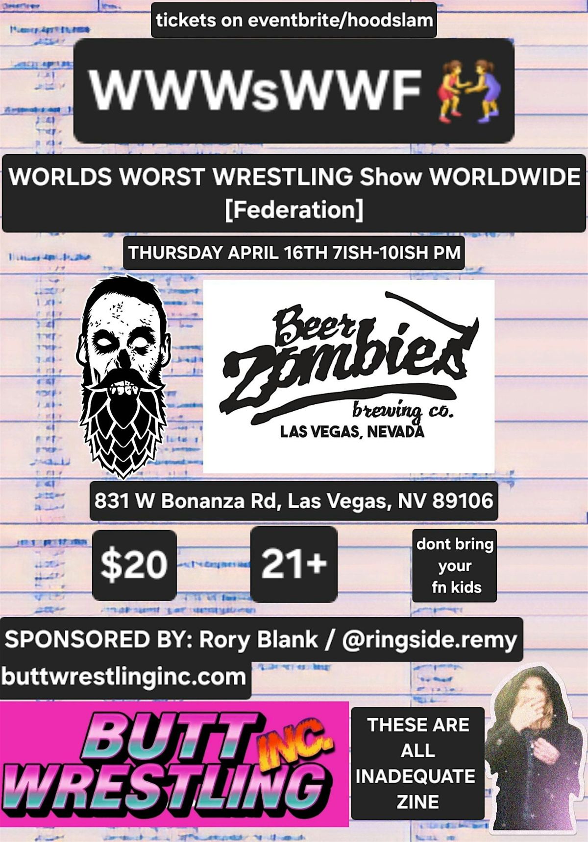 Thursday April 16th at 7ish PM at BEER ZOMBIES, audiences only aged 21 years or beyond will witness the deepest depths in the exploration of pro wrestlings hidden borders.
