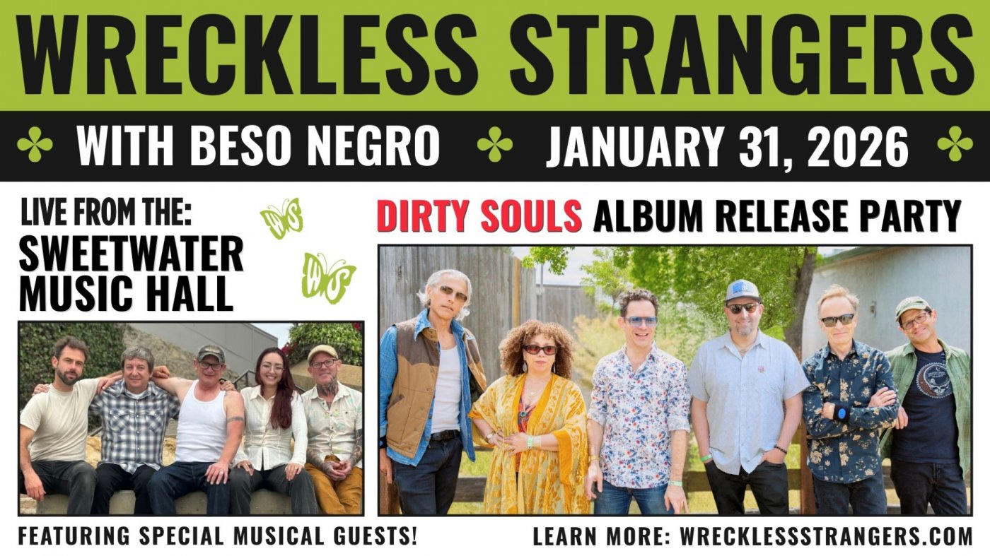 Wreckless Strangers are thrilled to once again grace the iconic Sweetwater Music Hall in Mill Valley, CA, on Saturday, January 31, to celebrate the release of their forthcoming album, Dirty Souls. Alt-gypsy-rock troubadours Beso Negro will open the show, setting the stage for an unforgettable evening of music and fun.