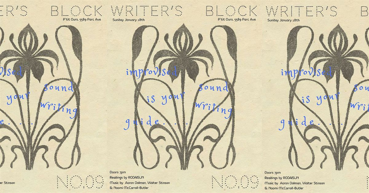 Writer's Block returns in full force with our ninth installment! This is a space to work on your writing ~ bring your notebook and let improvised jazz be your guide. With poetic performances by RODAISUN, music by Aaron Dolman (drums), Walter Stinson (upright bass), and Naomi McCarroll-Butler (saxophone and reeds).