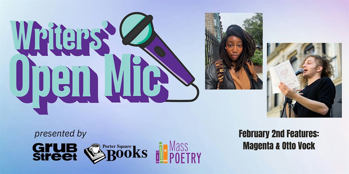 Writers’ Open Mic is free to attend, 18+, and registration is requested. Alcohol will be for sale for 21+ attendees. WOM is brought to you by GrubStreet, Porter Square Books, and Mass Poetry.