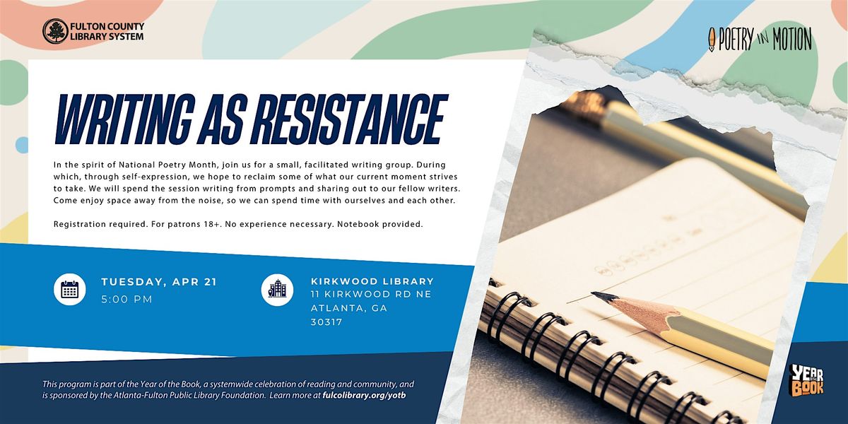 In the spirit of National Poetry Month, join us for a small, facilitated writing group. During which, through self-expression, we hope to reclaim some of what our current moment strives to take. We will spend the session writing from prompts and sharing out to our fellow writers. Come enjoy space away from the noise, so we can spend time with ourselves and each other.
