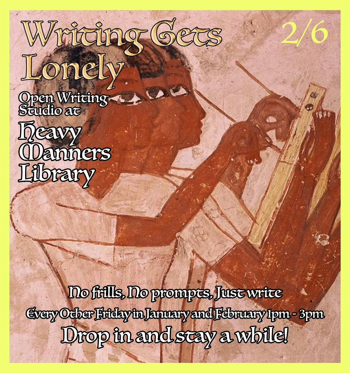 Join host Katja Bartholmess for an open writing studio at Heavy Manners Library from 1-3! No frills, no prompts, just write!