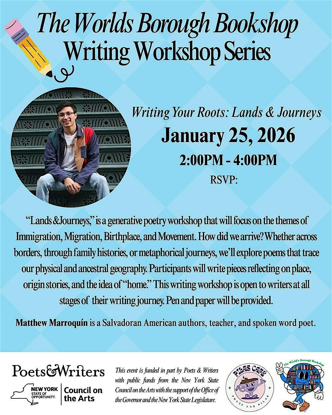 "Lands &Journeys, is a generative poetry workshop that will focus on the themes of Immigration, Migration, Birthplace, and Movement. How did we arrive? Whether across borders, through family histories, or metaphorical journeys, we'll explore poems that trace our physical and ancestral geography. Participants will write pieces reflecting on place, origin stories, and the idea of "home." This writing workshop is open to writers at all stages of their writing journey. Pen and paper will be provided.