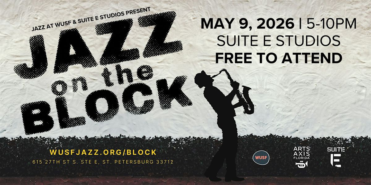 WUSF is proud to present Jazz on the Block: a Celebration of Live Local Jazz, a vibrant community event hosted at Suite E Studios in St. Petersburg. This free, five‑hour celebration of music and culture will take place from 5:00 PM to 10:00 PM on Saturday, May 9, 2026 coinciding with Second Saturday Art Walk in the Warehouse Arts District in downtown St. Petersburg, Florida. This show is designed to bring a fresh, modern energy to the local jazz scene.