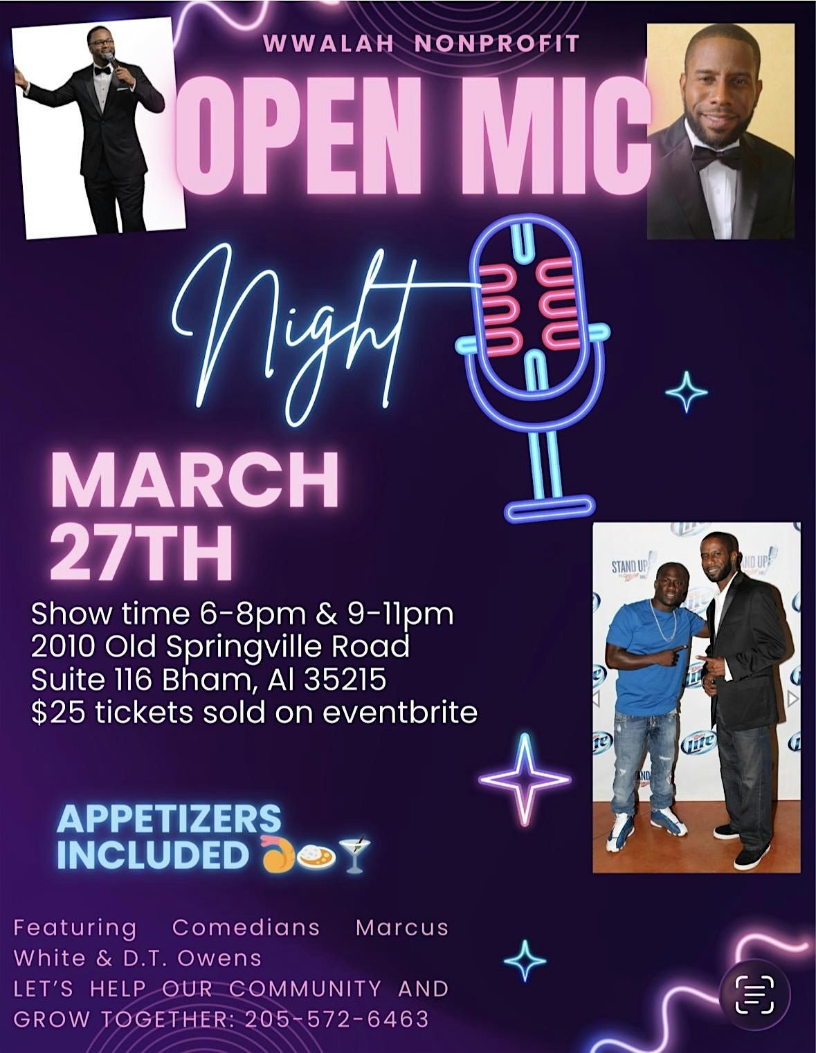 There are two shows. Each tickets is admission for one show. Free appetizers while they last. First show Comedian Marcus White will perform at the 6-8pm show. And the second show comedian D. T. Owens will perform at the 9-11pm show. There will be a monetary prize during the open mic session. Come have a blast with us while raising money to help the community.