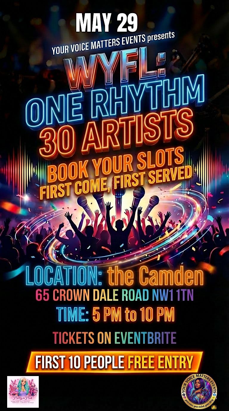 WYFL one rhythm 30 ARTIST first come first serve book your spot if you’re on the rhythm sign up to come perform May 29 at The Camden 5pm-10p