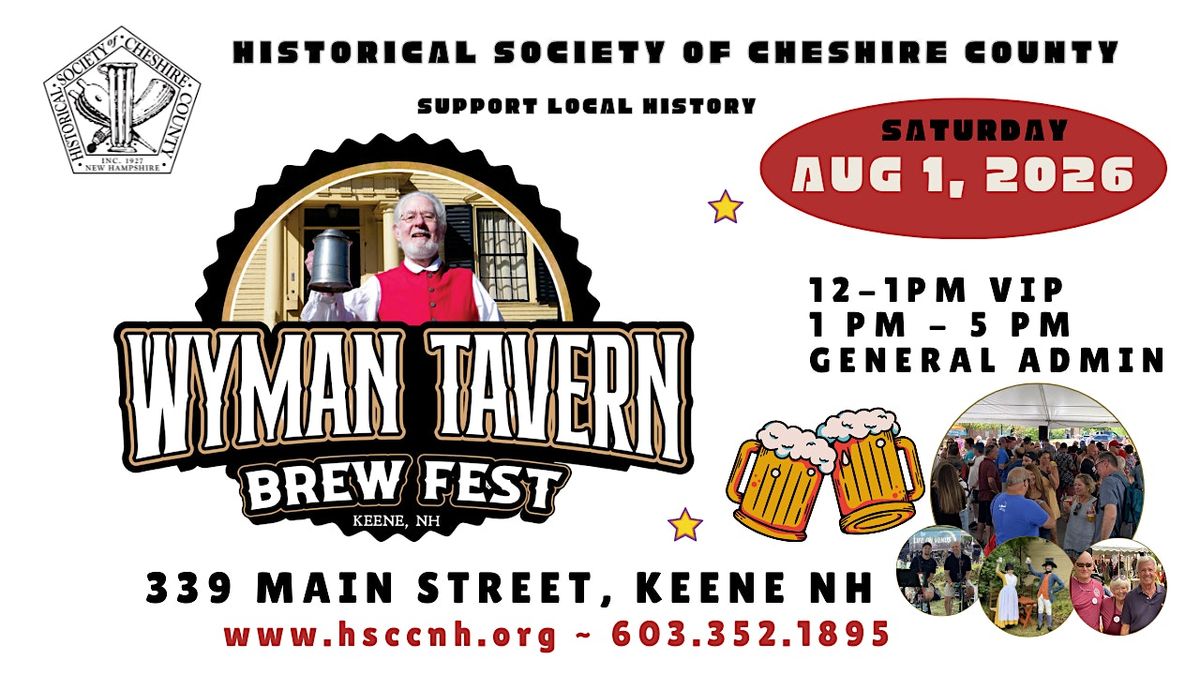 Keene locals and visitors have come to appreciate the Wyman Tavern Brew Fest as a great way to taste the region's finest craft beers, ciders, and spirits in an attractive setting on the grounds of the historic Wyman Tavern (1762) on Keene's Main Street. Enjoy food, music, and local character while supporting the Historical Society of Cheshire County. Proceeds will help people of all ages "find their place in history."