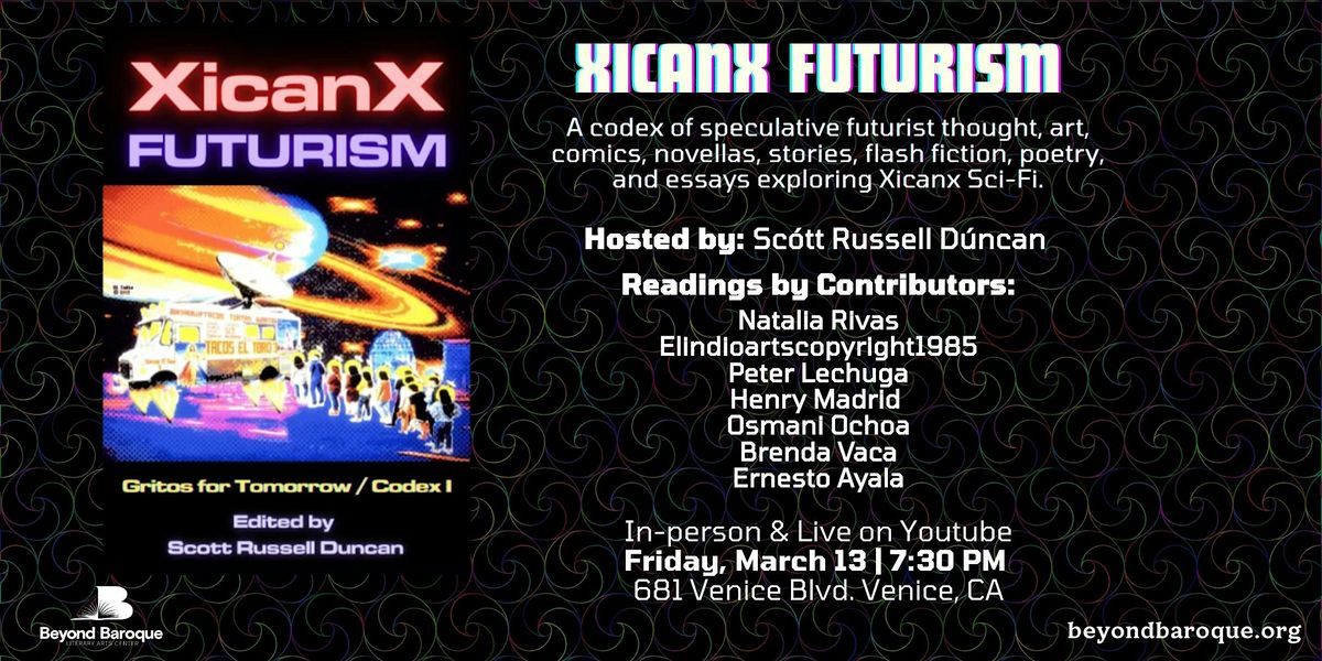 Join us for a night of readings from Xicanx Futurism: Gritos for Tomorrow, Codex I. Featuring Natalia Rivas, Elindioartscopyright1985, Peter Lechuga, Henry Madrid, Osmani Ochoa, Brenda Vaca, and Ernesto Ayala. Hosted by Anthology editor, Scótt Rusell Dúncan. The authors will present speculative futurist thought, art, flash fiction, poetry, and essays exploring the Xicanx tomorrow. Contributors include Xicanx sci-fi veterans, social justice thinkers, influential speculative artists, and trailblazing new writers charting the future of our gente.