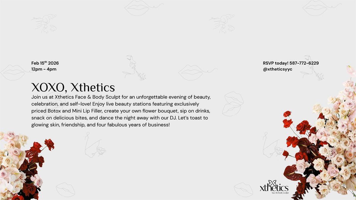 Join us at Xthetics Face & Body Sculpt for an unforgettable evening of beauty, celebration, and self-love at our XOXO, Xthetics Galentine's Day Event! This intimate gathering on February 15th celebrates sisterhood, glowing skin, and our four incredible years in business – all in the heart of Calgary. Perfect for you and your besties to pamper yourselves before Valentine's Day.