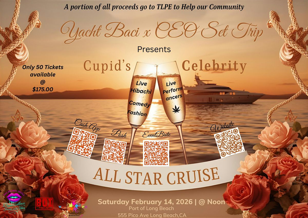 Get ready for an unforgettable in-person experience aboard the Yacht Baci! Join us for Cupid's All Star Celebrity Cruise, where good vibes meet stunning views and awesome company. It’s the perfect way to celebrate love, life, and everything in between. Don’t miss out on this fantastic chance to mingle with stars and soak up the sea breeze. Let’s make memories that sparkle like the ocean! 🌊❤️