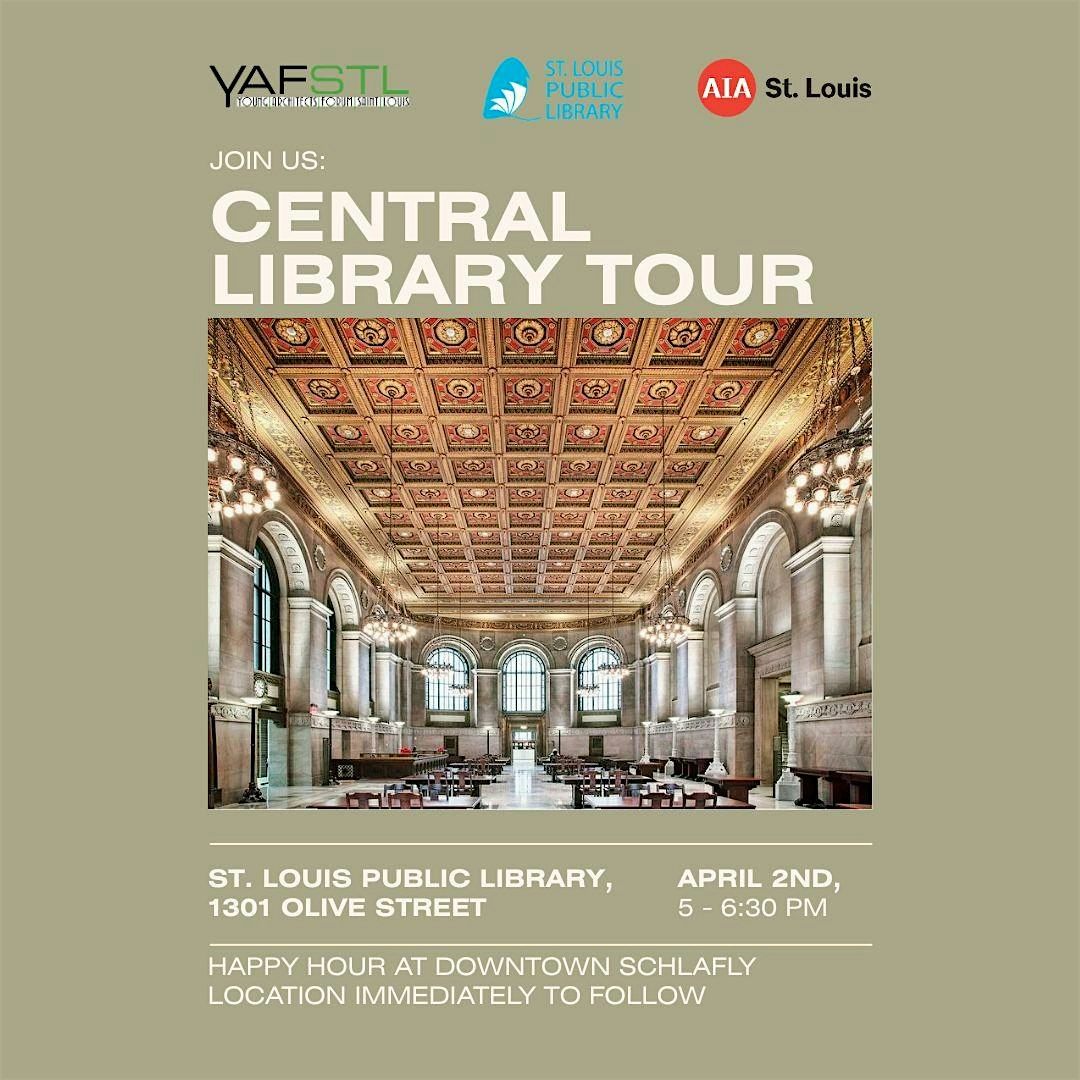 Join YAFSTL for a Central Library Tour including the Steedman Architectural Collection. Happy hour immediately to follow at Schlafly Taproom on Locust.