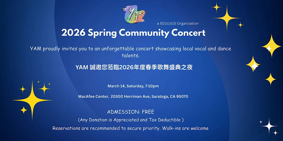 Youth Arts Movement, a 501(c)(3) organization, proudly invites you to join us for a joyful evening at the 2026 YAM Spring Community Concert, celebrating appreciation and community spirit, featuring live musical performances from our amazingly talented local singers and dancers. This in-person event promises an unforgettable evening, with performances that will leave you in awe.