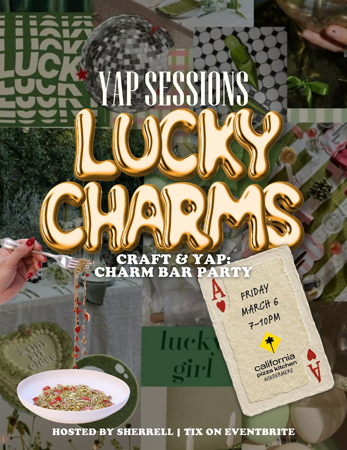 All charm bar supplies are provided — chains, charms, tools, and everything you need to build your piece. Just show up, order your favorite CPK dish or drink, and let the night unfold.