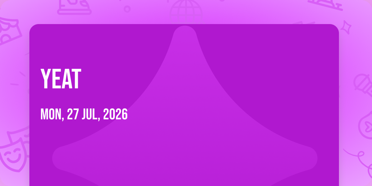 🎉 Welcome to Yeat, where the impossible becomes possible and dreams take flight! 🏛️ Join us at The Dome by Rutter Mills in the heart of Virginia Beach, VA for an event that will redefine your expectations. 📅 On July 27th, 2026 at 07:00 PM, witness the transformation of space and time into something truly magical. ✨ It's a curated experience combining the best of innovation, entertainment, and community spirit, creating moments that will be remembered for years to come. Whether you're a first-time visitor or a seasoned enthusiast, prepare to be amazed. 🎊 Book now to ensure your place in this unforgettable experience!http://maps.seatics.com/TheDome-VirginiaBeach_Endstage_2024-11-11_2024-11-11_2321_11112024_232250_SVGC_tn.png